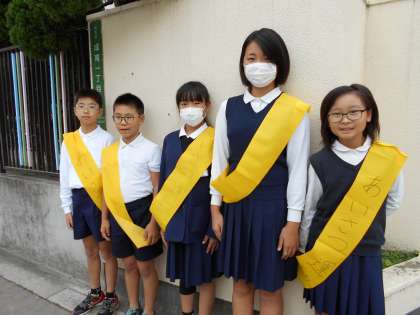 代表委員会のお兄さん、お姉さんが今週は、校門で交代であいさつ隊をします。「おはようございます」だけではなく、「こんにちは」「さようなら」などすすんで気持ちのよいあいさつのできる『成育の子』をめざしてがんばりましょうね。