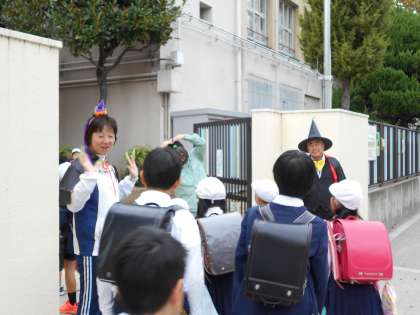 今日はハロウィン。校長先生と看護当番の先生が仮装して、玄関で子どもたちを出迎えました。