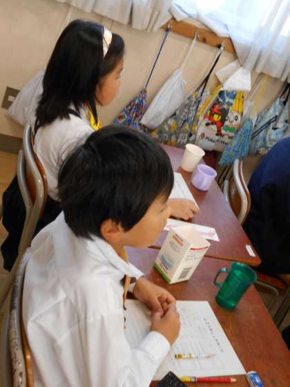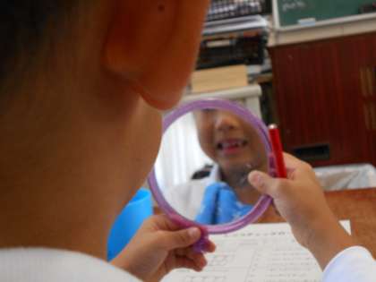 磨けているかどうか、染め出しチェックをすると、多くの児童に歯垢が残っていました。朝・昼・夜ときちんと磨いているようですが、「これからは、1本1本をていねいに磨くように」教えていただきました。