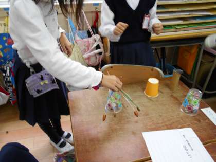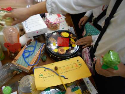 校庭や公園で「あき みつけ」をした1年生。遠足でひろってきたどんぐりやおうちで集めてきた空き箱を使って、おもちゃづくりをしています。