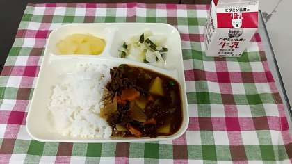 今日の給食は、「ビーフカレーライス」「牛乳」「野菜のピクルス」「りんご(カット缶)」です。