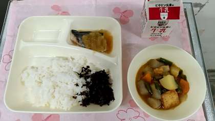 今日の給食は、「ご飯」「牛乳」「さごしのおろし醬油かけ」「含め煮」「牛ひじきそぼろ」です。