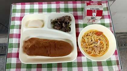 今日の給食は、「黒糖パン」「牛乳」「牛肉の香味焼き」「トマトのスープスパゲッティ」「なし(二十世紀)」です。