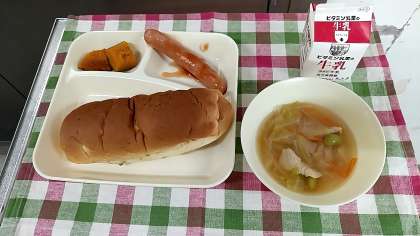 今日の給食は、「おさつパン」「牛乳」「ウインナーのケチャップソース」「スープ」「焼きかぼちゃ」です。