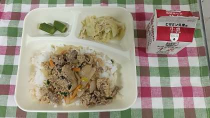 今日の給食は、「他人丼」「牛乳」「ささみとキャベツの炒め物」「オクラの甘酢和え」です。