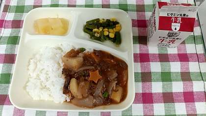 今日の給食は、「ハヤシライス」「牛乳」「グリーンアスパラガスとコーンのサラダ」「洋梨(カット缶)」です。
