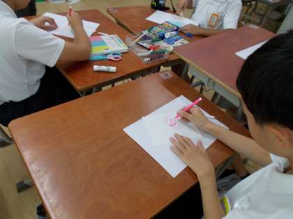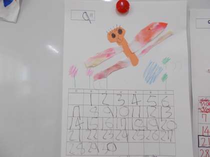 2学期最初のなかよし学級会を行いました。9月のカレンダーをつくりました。はじめに、半紙に好きな色の水性ペンで思い思いの模様や絵を描きました。それから、水をふくませた筆で自分の描いた模様や絵の上をなぞりました。すると、じわじわ色がにじみだし素敵な模様に広がっていきました。素敵な模様はとんぼの羽根に変身しました。顔にも表情が加わり、かわいらしいとんぼがとんだカレンダーが仕上がりました♪