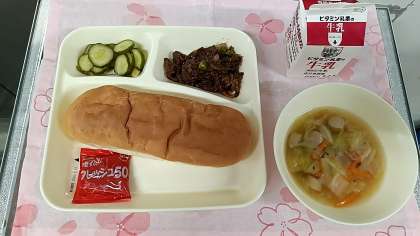 今日の給食は、「コッペパン」「いちごジャム」「牛乳」「牛肉のデミグラスソース煮」「ウインナーのスープ」「きゅうりのピクルス」です。