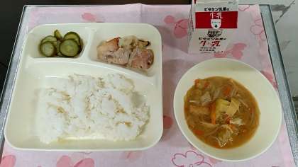 今日の給食は、「ご飯」「牛乳」「鶏肉の塩こうじ焼き」「さつまいものみそ汁」「きゅうりの甘酢和え」です。