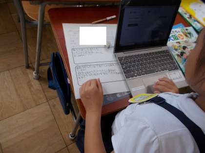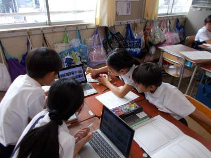 今度のスーパーマーケット見学に向けて、上手にタブレットを使用しながら、班で「お店の人が大切にしているところはなんだろう」や「聞きたいこと」などを話し合いました。