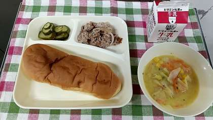 今日の給食は、「おさつパン」「牛乳」「豚肉のガーリック焼き」「コーンスープ」「きゅうりのバジル風味サラダ」です。
