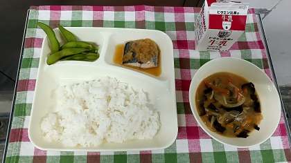 今日の給食は、「ご飯」「牛乳」「さごしのみぞれかけ」「かぼちゃの味噌汁」「枝豆」です。