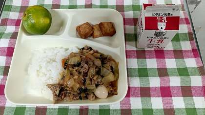 今日の給食は、「中華丼」「牛乳」「厚揚げの中華だれかけ」「みかん」です。