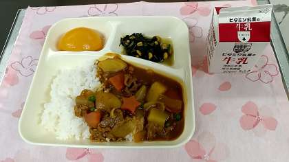 今日の給食は、「ポークカレーライス」「牛乳」「ほうれん草のソテー」「黄桃(缶)」です。