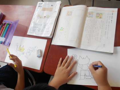 2年生の国語科「絵を見てお話を書こう」の学習です。一人ひとりが第三場面に合う話を考え、その話に合う絵を描きました。絵を描いた後はセリフなども考えていきますが、どんな話になるか楽しみですね!