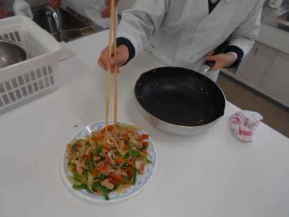 6年生の家庭科の調理実習の様子です。野菜を炒めた時の食材の変化を観察しながら、班で協力して美味しい野菜炒めを作りました。野菜を切ったり、皮をむいたり、炒めたりと、一人ひとりが役割を決めて、手際よく、楽しく活動していました!