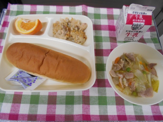 今日の給食は、「コッペパン」「ブルーベリージャム」「牛乳」「押麦のグラタン」「スープ」「いよかん」です。