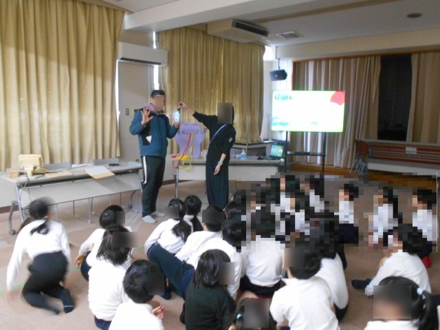 1月14日(水)に2年生の発育測定と保健指導を行いました。保健指導のテーマは「手あらいをしよう」です。咳やくしゃみでウイルスや菌が飛ぶ長さをテープで実際に見てみました。「こんなに飛ぶの?」と驚いている児童がたくさんいました。ブラックライトを当てると白く光るクリームを使って、どのようにウイルスや菌がうつるかを実験しました。気づかないうちに手にはウイルスや菌がついています。こまめに手洗いをしましょう。