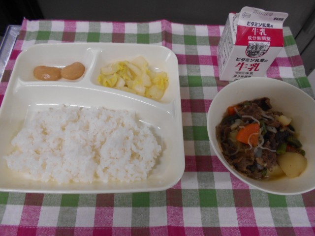 今日の給食は、「ごはん」「牛乳」「肉じゃが」「はくさいのゆず風味」「白花豆の煮物」です。