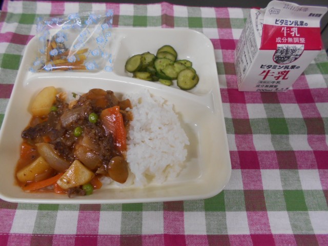 今日の給食は、「ハヤシライス」「牛乳」「きゅうりのバジル風味サラダ」「芋けんぴフィッシュ」です。