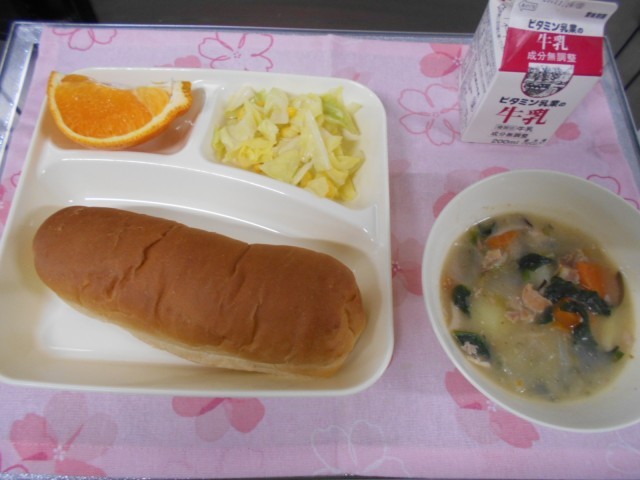 今日の給食は、「黒糖パン」「牛乳」「鶏肉とほうれん草のシチュー」「キャベツとコーンのサラダ」「デコポン」です。
