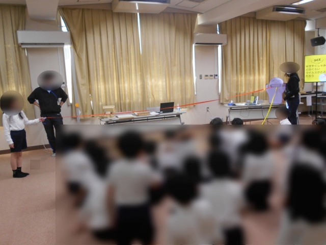 咳が出るときは手でおおってはいけないのかな?蛍光塗料を使って感染の広がり方を実験で見た後、感染症を予防するために必要なことを発表し合いました。せきエチケットを守りながら、一人ひとりが手洗いや換気を心がけて、自分もみんなも元気に過ごせるようにしましょう。