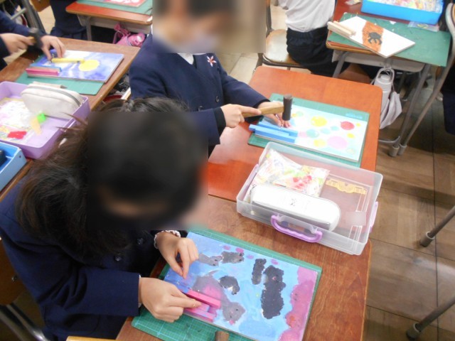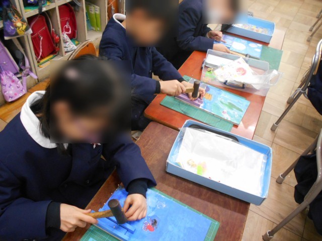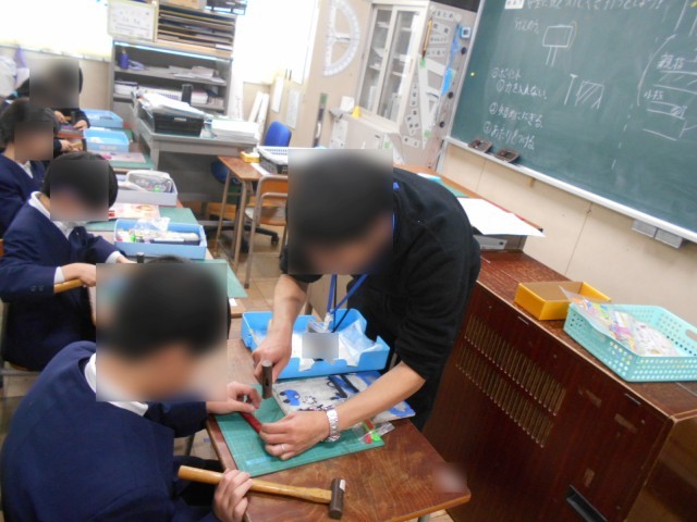 3年生の図工科「くぎ打ちトントン コンコンビー玉」の学習の様子です。安全に気を付けて、くぎ打ちをしました。