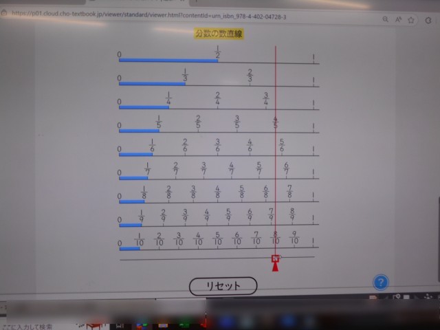分数の数直線を使って、大きさの等しい分数を見つけました。