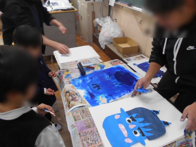 それぞれの教室に移動して、「赤おに」「黄おに」「青おに」「緑おに」を作りました。