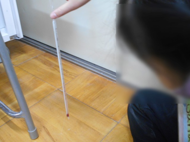 温度計で教室の上の方と下の方を測り、温度の違いを知りました。