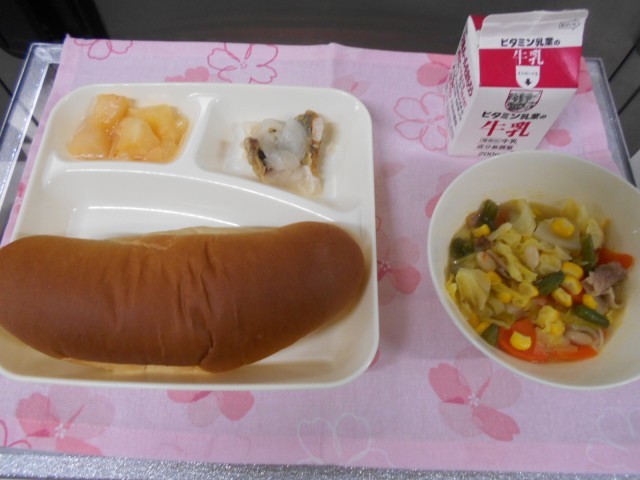 1月27日 今日の給食は、「コッペパン」「いちごジャム」「牛乳」「ミートボー...