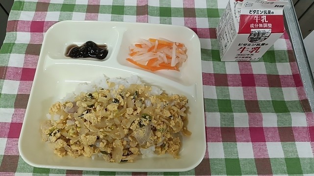 1月30日 今日の給食は、「親子丼」「牛乳」「紅白なます」「黒豆の煮物」です...