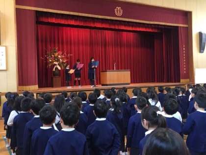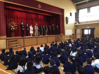 始業式では、新6年生が今年度の抱負の作文を読み、今年度頑張りたいことを全児童の前で発表することができました。その後、新転任の教職員の紹介や担任発表がありました。