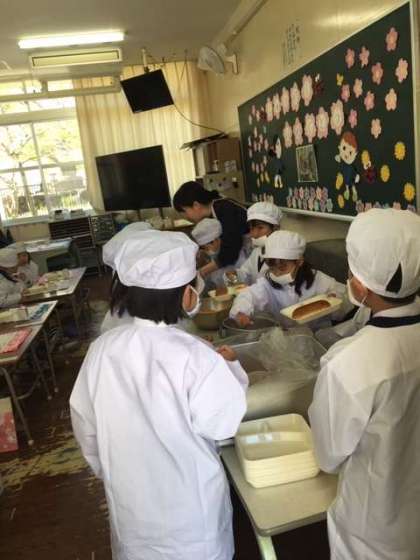 1年生は、初めての給食で給食当番が給食室から重そうな食缶を友だちと力を合わせて運んでいました。教室では自分たちで配膳し、おいしくいただくことができました。