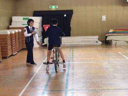 高学年は自転車の正しい乗り方、低学年は正しい歩行のし方を実際に講堂に信号や道路標識の模型を置いて体験することができました。