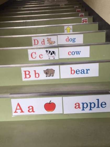 今年度から校舎内の階段に英語の掲示物を貼り、児童が英語に触れる機会を増やす取り組みをしています。