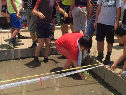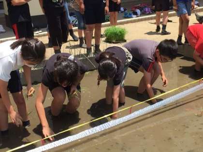 子どもたちは田んぼの泥に足を取られながらやさしく苗をつかみ丁寧に植えることができていました。