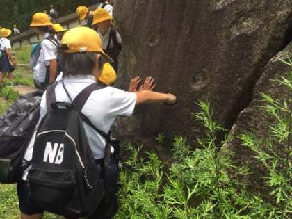 ピース大阪見学の後は、大阪城公園に残されている戦跡を見学しました。石垣に残されている握りこぶしくらいの大きさの機銃掃射の跡をみてその威力の大きさに驚いていました。