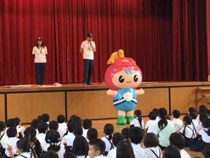 そのあと城東区のマスコットキャラクターのコスモちゃんや城東区住みます芸人のアンプリも登場し子どもたちは大喜びでした。アンプリは漫才の中に安全に過ごすための方法を入れて楽しく安全について教えてくれました。