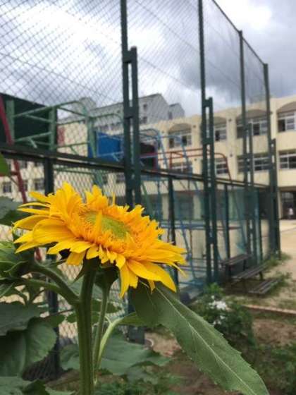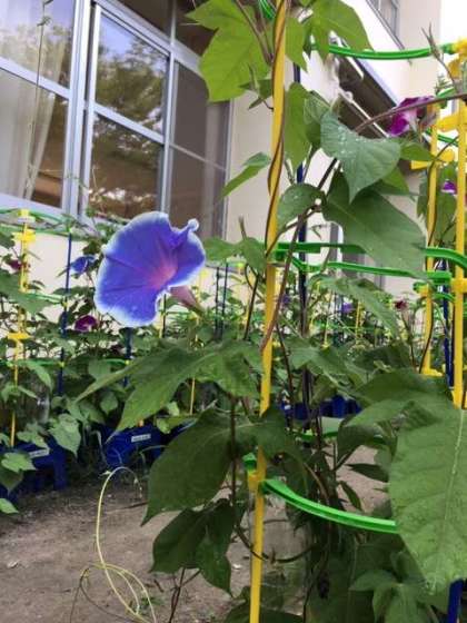 学習園に1年生が育てている朝顔が花を咲かせていました。ヒマワリが花を咲かせたり、トマトやピーマンなどの夏野菜が実をつけたりと植物は一足早く夏本番を迎えています。