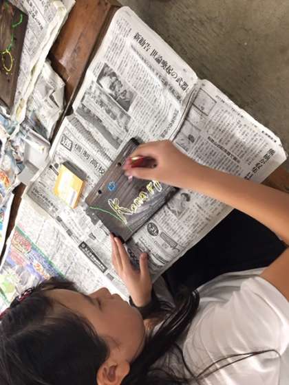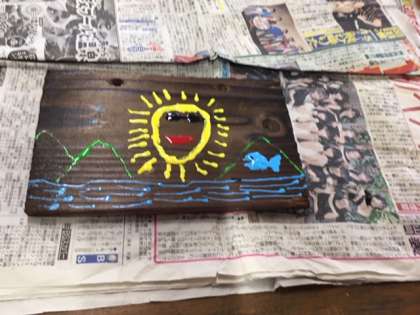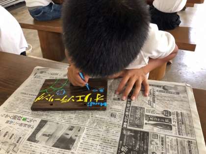 昨日磨いた焼き板に絵付けをしました。林間学習でできたたくさんの思い出を描きました。