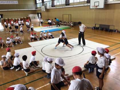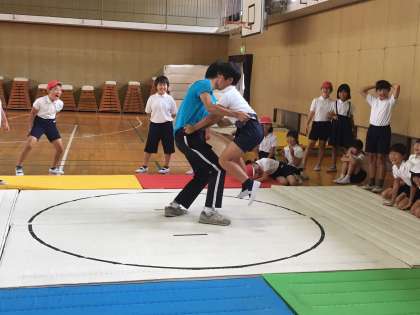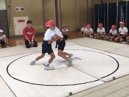 4年生がすもう体験をしました。すみれ小学校では昔、地域に国技館があったことから授業ですもうを取り組んでいます。