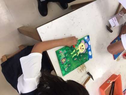 3年生が図画工作でコリントゲームを作りました。一昨日から3日間地域の方が子どもたちにくぎ打ちを教えに来てくれました。