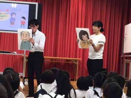 最初に認知症は誰にも起こる可能性があることや認知症の症状などを説明してもらいました。次に担任の先生がお年寄りと孫になって劇をして、周りに認知症の方がいるときどう対応すればよいかということを考えました。