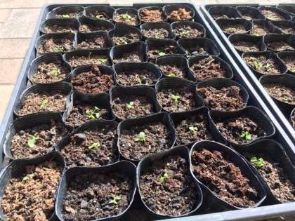 今月初めに撒いたすみれの花の芽がすくすく育ち本葉が2〜3枚になってきました。