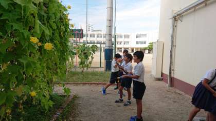 4年生が理科の「空気と水のはたらき」のまとめとして、講堂と学習園で空気鉄砲と水鉄砲を楽しみました。