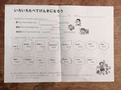 「いろいろたべてげんきになろう」をテーマに今日の給食献立を栄養素別に分けて、どの食べ物が欠けても元気な体にならないことを学習しました。