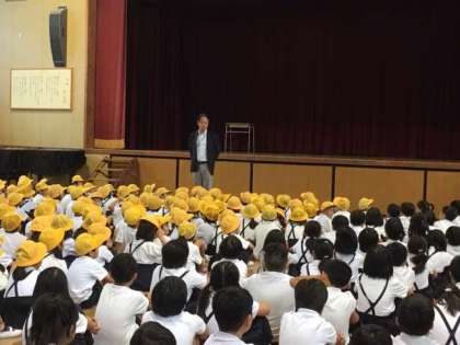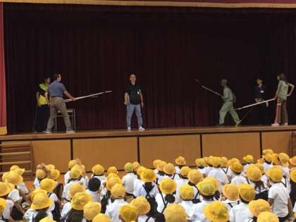 城東警察の方に不審者の役になっていただき、実際に110番の通報をしたり教職員がさすまたを持って不審者と対峙したりしました。児童は教室の鍵を締め身をかがめて不審者から身を隠すようにしました。