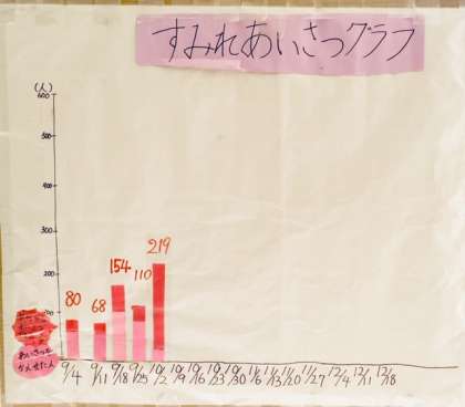 すみれ小学校の玄関を入ってすぐのところに児童会が作った「すみれあいさつグラフ」が掲示されています。