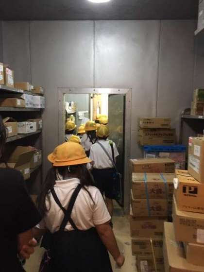 見学では店内のようすやバックヤードのようすを見学させてもらいました。バックヤードでは野菜を切っているところや切り身にする前の大きなサワラを見せていただいたり、−25度の冷凍庫に入らせてもらったりと普段ではなかなか見れないところも見学させてもらいました。